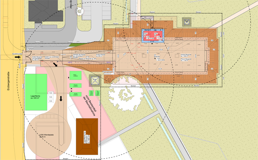 Die Bauarbeiten zur Errichtung der Tiefgarage können beginnen, sobald die Baustelleneinrichtung abgeschlossen ist. Das Unternehmen, das den erweiterten Rohbau ausführt, wird unter Einbeziehung der Bestandbäume und des vorhandenen Flächenkollektors zur Erdwärmegewinnung den Kranstandort, die Verkehrsflächen für Lkws sowie die Materiallagerflächen festlegen.